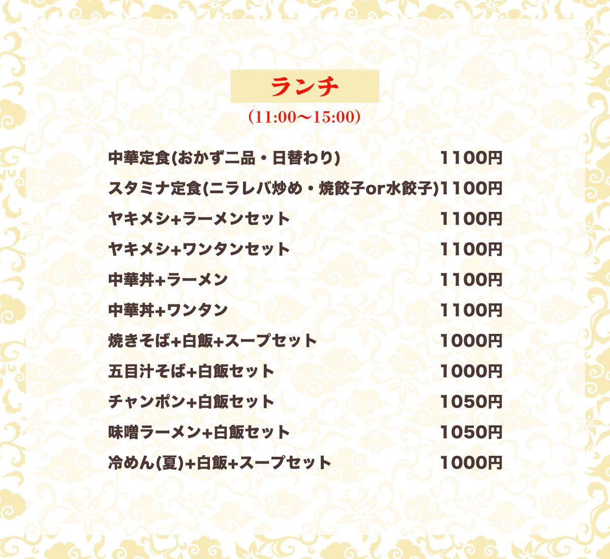 - 11:00~15:00 (料理L.O. 14:30 ドリンクL.O. 14:30)